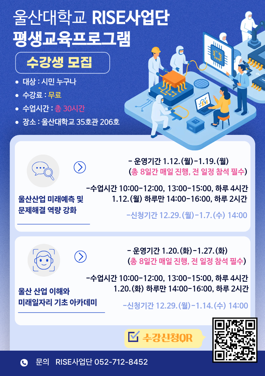 자기계발과 배움의 기회를 놓치지 마세요. 문의 : RISE사업단 김정연 연구원 / 052-712-8452 / jyeon12@ulsan.ac.kr