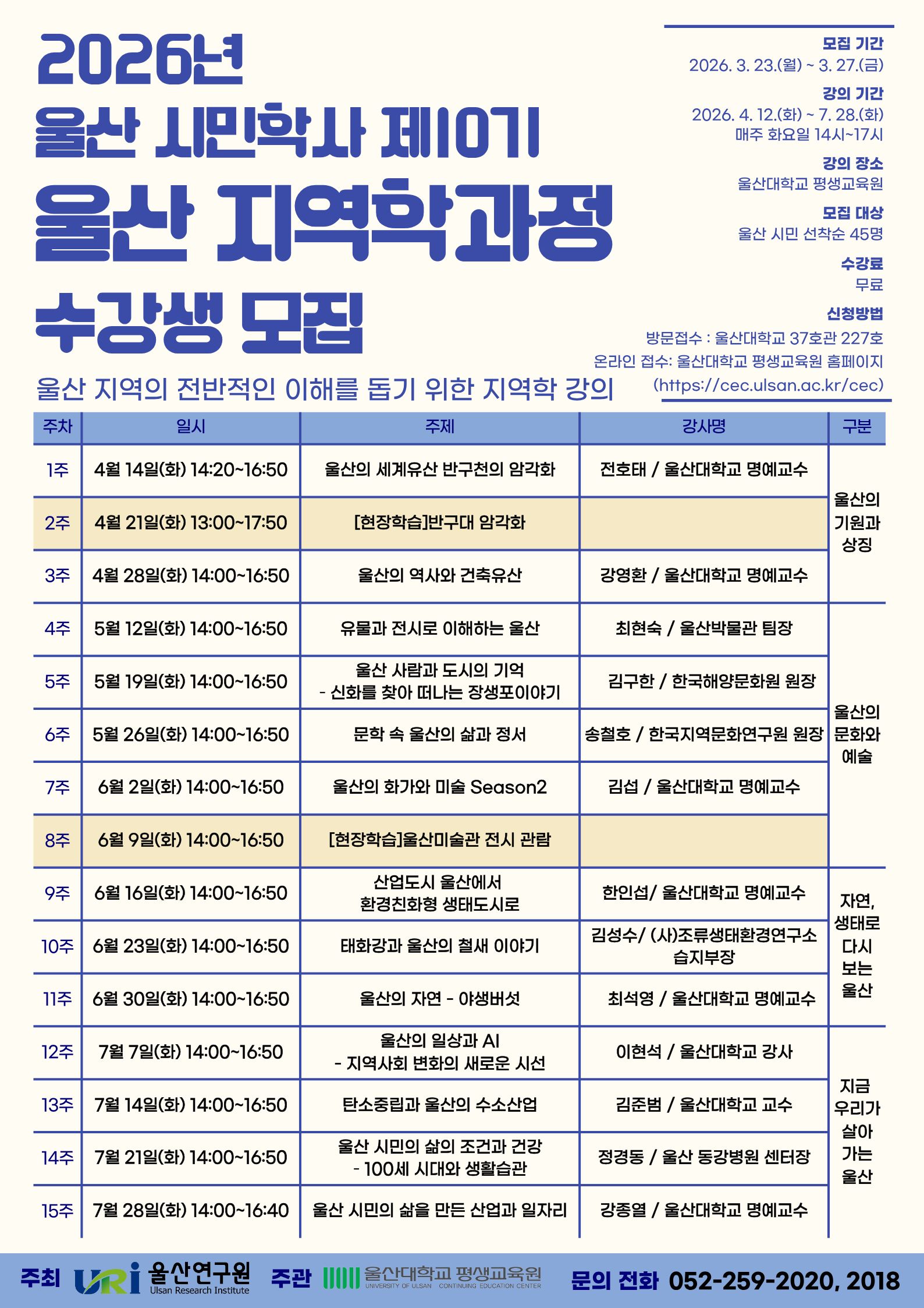 2026년 울산시민학사 제10기 울산지역학과정 수강생 모집 ▣ 수강대상 : 울산시민 선착순 45명 무료강좌 (무단 결석 2회 이상 시 프로그램 참여에 제한이 있을 수 있음) ▣ 강의기간 : 2026. 4. 14.(화) ~ 7. 28.(화) 14시~17시
